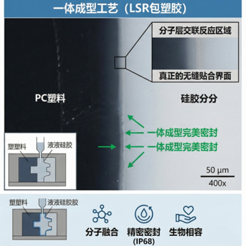 在過(guò)去,當(dāng)我們想要在一個(gè)硬質(zhì)的塑料或金屬零件上增加一層柔軟、防滑、防水的硅膠時(shí),通常采用的是“物理拼裝 + 膠水粘合”的工藝。但這存在三個(gè)致命的物理缺陷:熱脹冷縮差異: 材質(zhì)不同,膨脹系數(shù)不同。在經(jīng)歷高低溫變化時(shí),膠水層容易產(chǎn)生微觀撕裂。化學(xué)老化: 傳統(tǒng)粘合劑在接觸汗液、洗滌劑或長(zhǎng)期紫外線(xiàn)照射下,會(huì)迅速老化發(fā)硬、失去粘性。公差疊加: 兩個(gè)獨(dú)立做好的零件拼在一起,必然存在裝配公差,導(dǎo)致縫隙的產(chǎn)生。隨著醫(yī)療器械、新能源汽車(chē)電子、高端智能穿戴對(duì)密封性、生物相容性的要求越來(lái)越高,傳統(tǒng)的裝配方式已經(jīng)觸及了行業(yè)天花板。